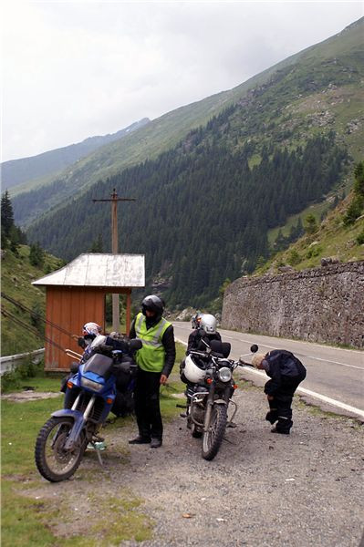 Dosáhneme závěru údolí, ale po pár vlásenkách je jasno, že „voda jde“. Koneckonců, jsme hluboko v horách, dá se to čekat. Vrcholky se utápějí v černých nacucaných mracích. Jindra staví na malém parkovišti s miniaturní dřevěnou kapličkou a nastává opětné tasení dešťovek. Jako jindy, mám je na sobě v cuku letu. Sotva jsem hotov, začíná nejprve drobněji, ale po chvilce čím dál intenzivněji pršet. Zapadnu do kapličky, neb je jasno, že dál asi v tomhle cuháku nepojedeme. Hned za mnou se k nějakému pravoslavnému svatému natěsná všechen mančaft, pouze Honza díky své výšce zůstává napůl venku. Ale má dešťák, tak to tak nevadí :-).