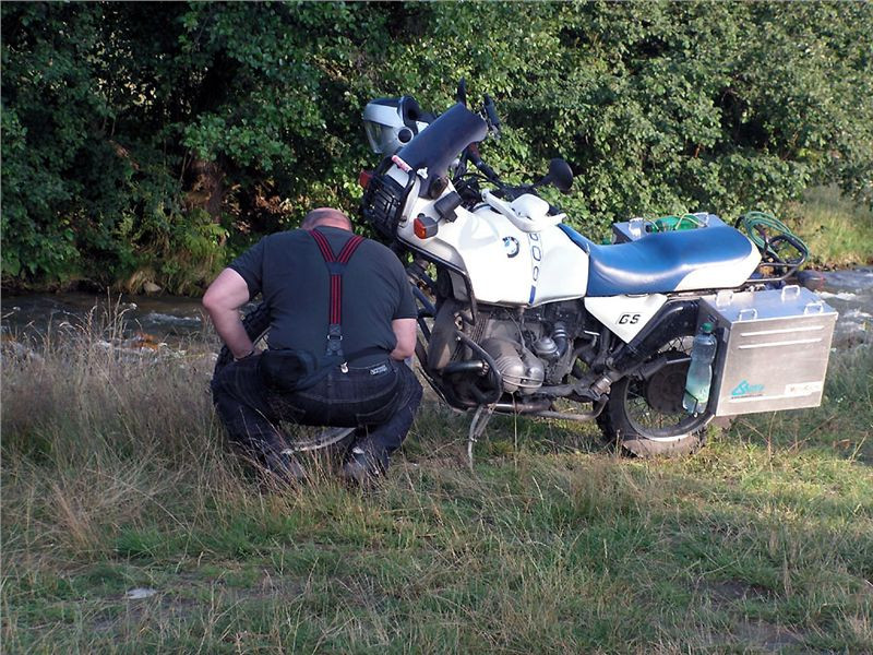 Zaparkujeme, odložíme si motocajky a zkoumáme, kudy do vody. Objevíme pouze jeden slušný vlez, který promptně a nekompromisně obsazují naše divoženky, a hlavně Eva nás zahání kam možno nejdál. Honza rezignuje, zalehne do stínu a hned usíná.