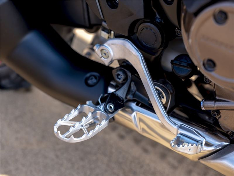Nízký štítek umožňuje jezdci volný pohyb vpřed a vzad, a to vsedě i vstoje; k ostřejšímu vzhledu a mimo jiné i ke snížení hmotnosti o celkem 4 kg přispívají kompaktní chrániče rukou a chránič olejové vany.