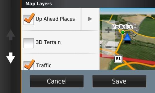 Nyní je v Zumo 590 "naše" funkce, která umožňuje přímo vypnout zobrazení 3D terénu a mapa získá na čitelnosti a kontrastu. Mimochodem v možnostech nastavení zobrazení vrstev je řada užitečných voleb - zobrazení určitých typů POI ke kterým se blížíte (benzínky, odpočívadla, restaurace) nebo zobrazení aktuální dopravy z připojeného programu Link. A pochopitelně klasické volby - prošlá stopa apod. Stejně jako Zumo 350/390 umožňuje Zumo 590 zobrazovat mapy trošku v odlišných barvách. Součástí dodávky je několik přednastavených "setů". Navigace od Touratech CZ budou obsahovat dva nebo tři další sety, které jsme testovali několik měsíců a zvyšují kontrast zejména při ježdění offroad.