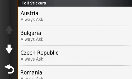 Podstatnou změnou prošlo ale nastavení omezení, kudy trasa vést nemá (tzv. avoidances - v debilním českém překladu výrobce "objížďky"). Kromě všech známých prvků, které nechcete na trase potkat, je zde nová věc - samostatná stránka nastavení vyhýbání se placeným silnicím v konkrétní zemi. Tato funkce musí být podporovaná mapou - v době, kdy píšu tento text, to byla mapa City Navigator 2014.3 Gamma NTU, která umožňovala nastavit aby navigace nevedla na placené silniční úseky např. v České republice a v Rakousku, vyžadující dálniční známku. Každá země má možnost individuálního nastavení (zeptej se / vyhýbej se / můžeš tam jet).