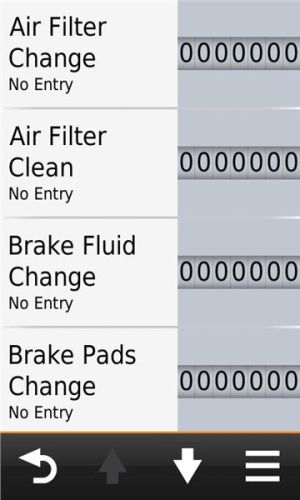 Zajímavou funkcí známou i z přístrojů Zumo 350/390 je vedení motocyklového deníku pro různé servisy a výměny. K dispozici je v tomto okamžiku (psáno na začátku února 2014) celkem 17 počitadel různých situací. Mezi ně patří třeba výměna vzduchového filtru, čištění vzduchového filtru, výměna brzdovky, výměna destiček, výměna oleje, výměna palivového filtru, výměna přední nebo zadní pneumatiky atd. Zadáte aktuální stav kilometrů podle tachometru motocyklu a navigace si pamatuje datum a stav tachometru poslední výměny. Kategorie je možné upravit (přejmenovat podle sebe) a dopsat i poznámku týkající se servisu.
