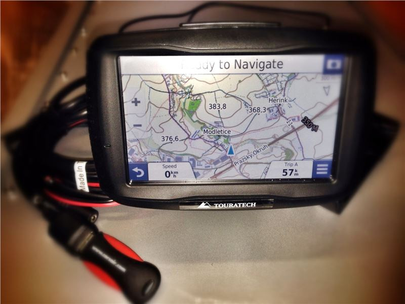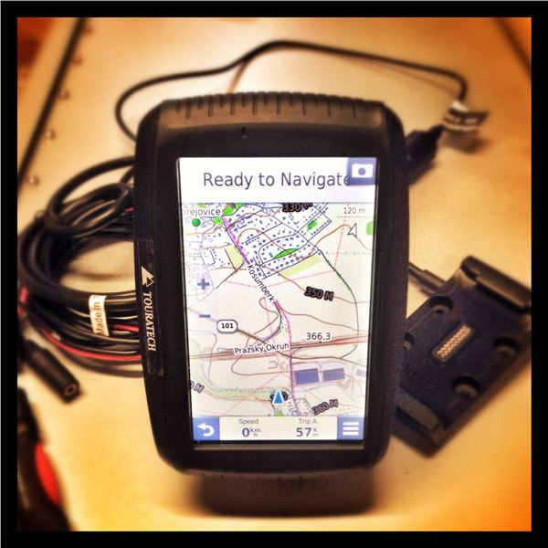 Navigace byla namontovaná ve svislé poloze uvnitř kokpitu silně upraveného motocyklu pro offroad ježdění a upevněná pomocí standardního plastového držáku Garmin (napájecích zad) a klasické sestavy kloubů RAM. I v kamionu jsme jí používali v režimu "portrait", tedy s displejem na výšku.