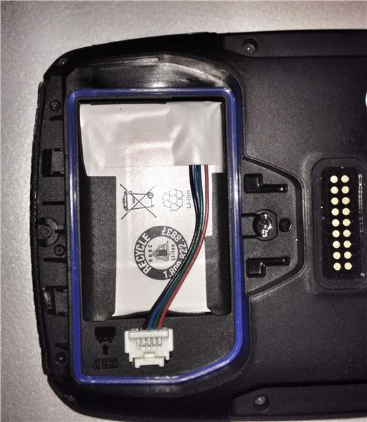 Na druhé straně jsou dvířka bateriového prostoru, která jsou jištěná kovovým otočným zámečkem připomínajícím zmenšenou verzi zámku baterie na GPSMAP 620. Pod dvířky je akumulátor, propojený s elektronikou navigace krátkým čtyřžilovým kabelem s konektorem. To je také změna - k lepšímu. Konektor je zárukou, že i při velkých otřesech nebo určité výrobní toleranci rozměrů akupacku nebude docházet k výpadkům napájení a nutnosti podkládání baterie složenou vizitkou apod. Vlastní akumulátor má napětí 3,7 V a kapacitu 2000 mAh.