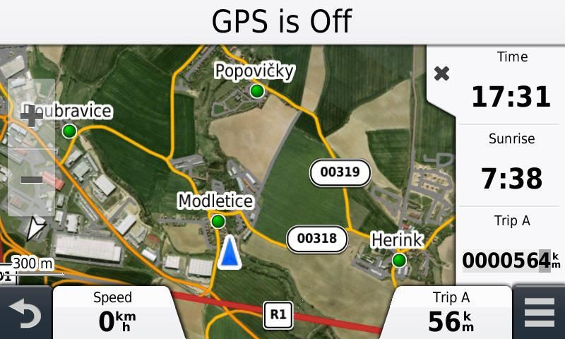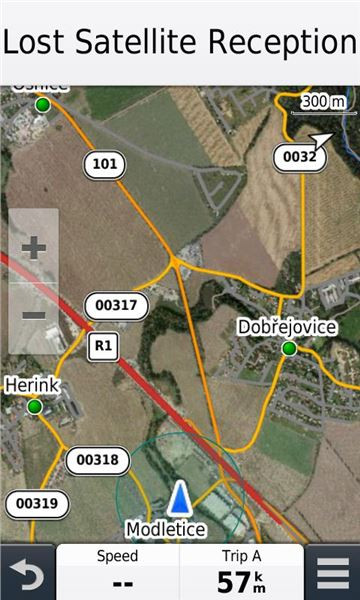 Z navigace nezmizela také stránka zobrazující stav satelitů (sílu signálu). Při stisku ikony vozidla na mapě naskočí stránka známá z jiných modelů navigací Garmin - "Where I am", která zobrazí nejbližší křižovatky, adresu a další POI podle výběru (nemocnice, policie, benzínky..). Vpravo nahoře je tlačítko pro uložení pozice do oblíbených waypointů s nějakým názvem. To je stejné a praktické jako dříve.