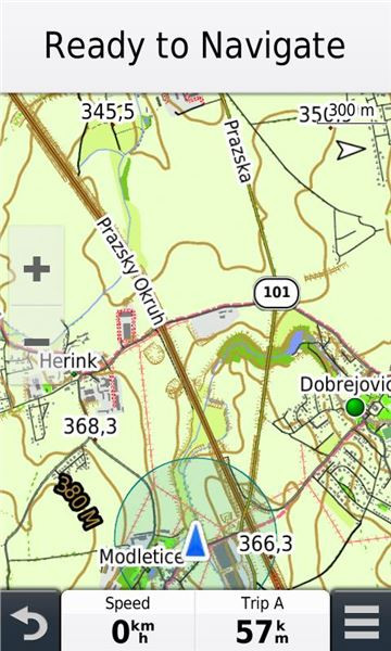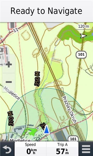 Zumo 590 umožňuje (konečně) zobrazit kružnici přesnosti, podobně jako to dělala GPSMAP 278C. Funkce, kterou jsme měli poměrně vysoko v naší tabulce požadavků, je konečně realitou. Na screenshotu vidíte ikonu vozidla a kolem ní kroužek. To je aktuální chyba (přesnost) GPS příjmače v daném místě a znamená to, že se nacházíte někde v tom kruhu, ale nemusí to být 100% tam, kde je nakreslená ikona. Velmi praktická věc např. při ježdění v lese, kde přesnost pod stromy často padá na hodnoty 70 m apod.