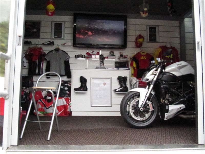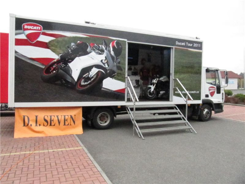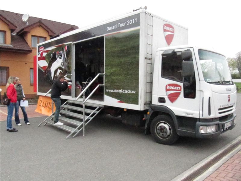 Kolem poledne vyjíždím směr Milín, počasí není zrovna ukázkové a teploměr ukazuje pod 10 °C. Ale co, tohle mi přece náladu nepokazí! Před hotelem vidím stát všechny dvoukolové krásky a kamion s prezentací oblečení a doplňků Ducati Apparel. Výrobky se zde dají i zakoupit.