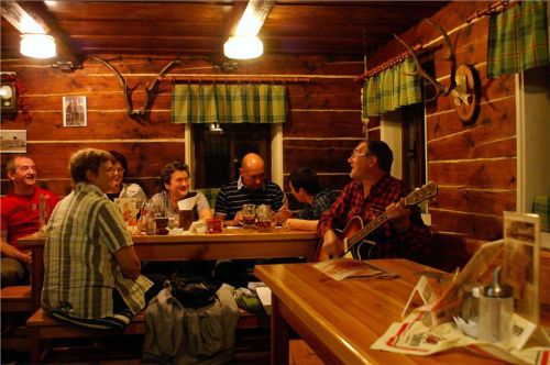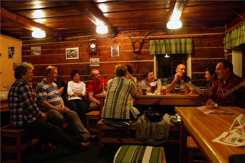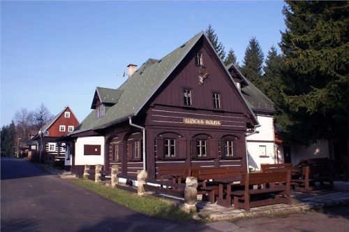 Zkultivujeme se, převlíkneme do občanskýho, a davaj dolů, do malé jídelničky. Přeci jen, je k osmé a hlad a žízeň už dávají o sobě vědět. Trochu nás překvapí skoro zaplněná místnost, samý halasící německý důchodce, za Čechy jsme tu jen my dva a obsluha. Hmmm, no, uvidíme …. Přinejhorším by se dalo na pivo migrovat do nedaleké Chaty pod Luží.