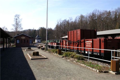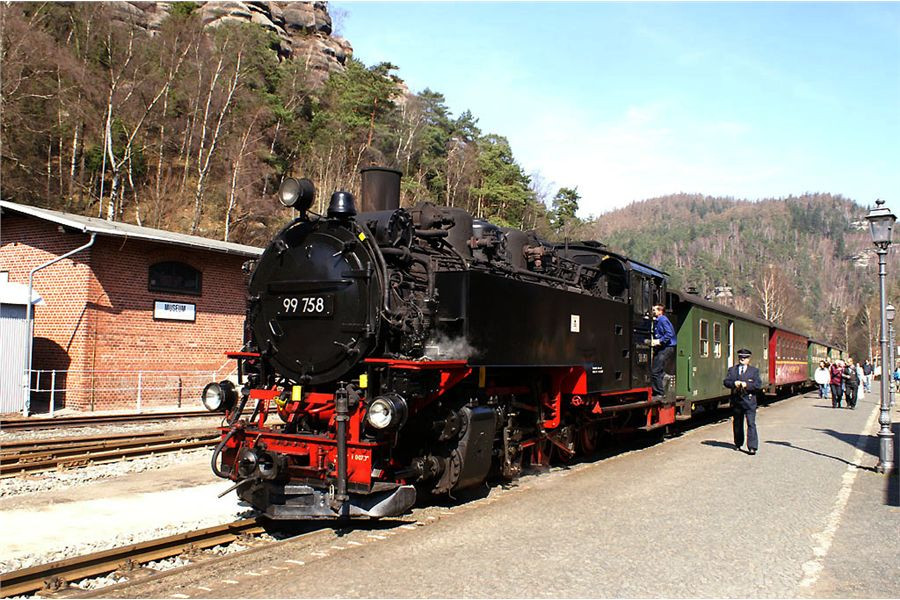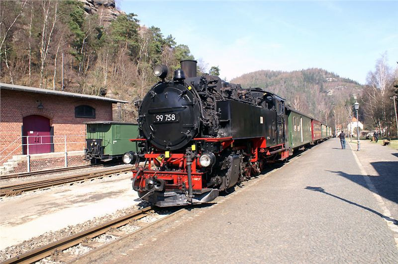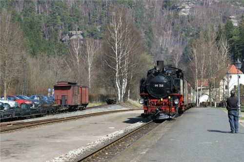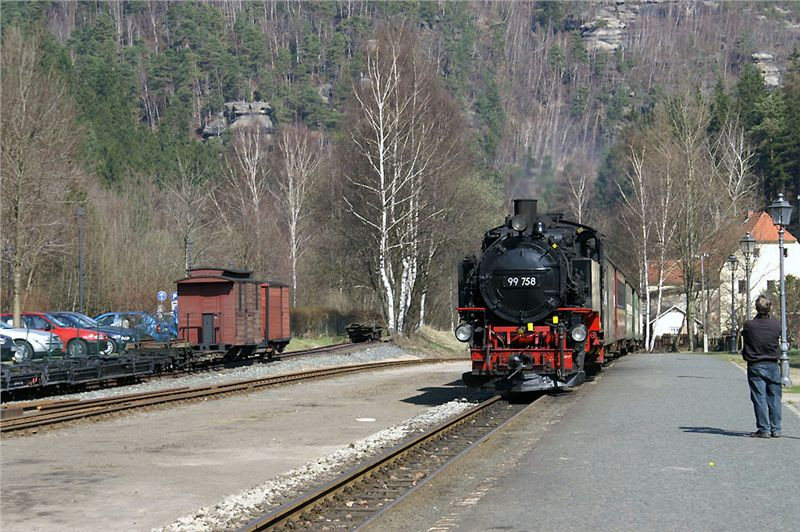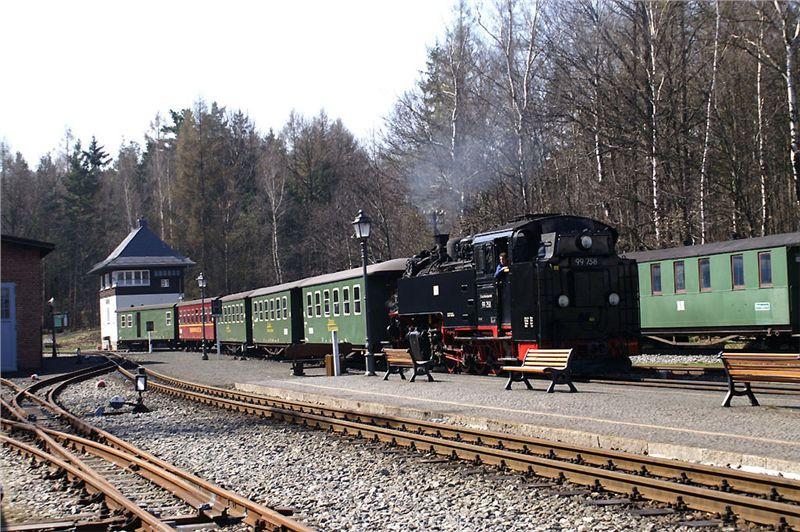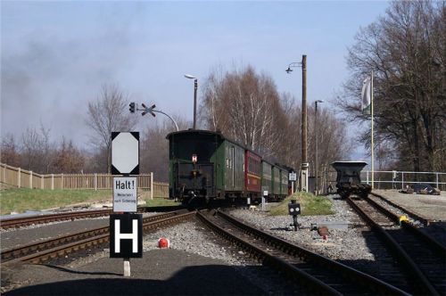 Supění a pufání z údolí nás oživí z dopolední lenosti. Perfektně udržovaná souprava dorazí, vystoupí poměrně dost vejletníků a lokomotiva přešíbuje na druhý konec soupravy. My skočíme na své stroje a zamíříme silničkou motající se kolem perfektně udržované trati do nedalekého Olbersdorfu, kde se stýkají obě větve úzkokolejky.