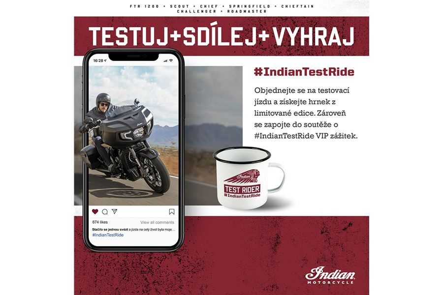 Kromě toho, že si zájemci mohou vyzkoušet jakýkoli nový model z nabídky značky Indian Motorcycle, mají šanci vyhrát jedinečný a nezapomenutelný zážitek. Navíc každý účastník automaticky získá exkluzivní hrnek Indian Motorcycle Test Rider.