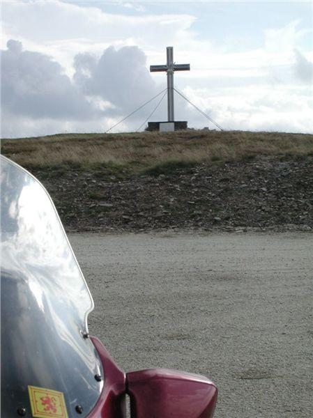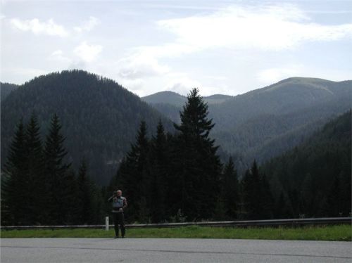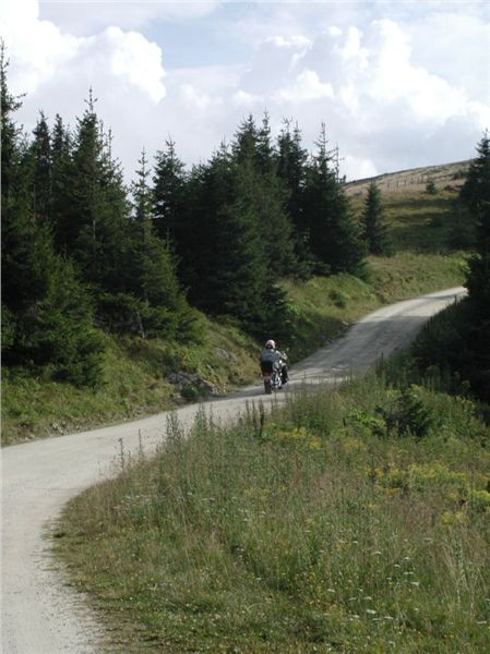 Silnička, spíše cesta, je opět makadamová a opět velice slušné kvality, takže se dá docela rychle drápat vzhůru. Myšákovi na cruiseru to přeci jen tak rychle nejde, ztrácím jej v zatáčkách, ale to nevadí, odbočit není kam a ztratit se nelze. Asi dva kilometry mne přivedou na hranici lesa, nad ní už je jen kleč nebo holiny. V první výhledové zatáčce stavím, na čumendu a hlavně na tasení foťáku a zachycení nejen scenérií kolem, ale i Michala ve stoupání. Zadaří se, mávnutím jej pošlu, ať pokračuje, ještě chvilku postojím a vydám se nahoru též.