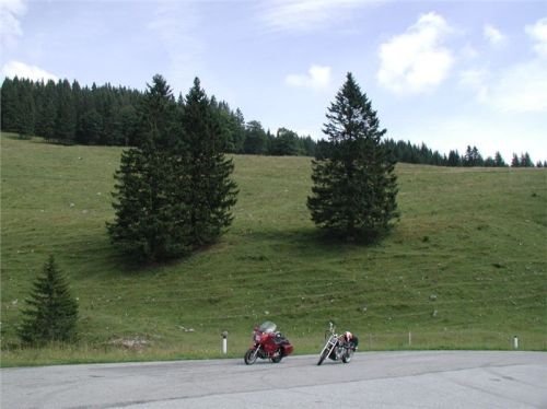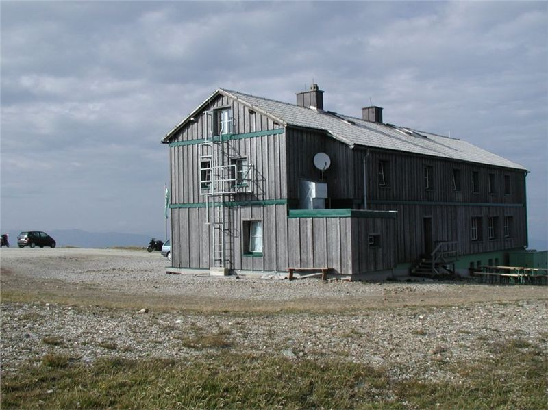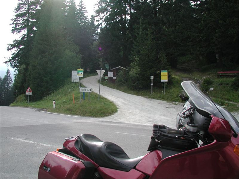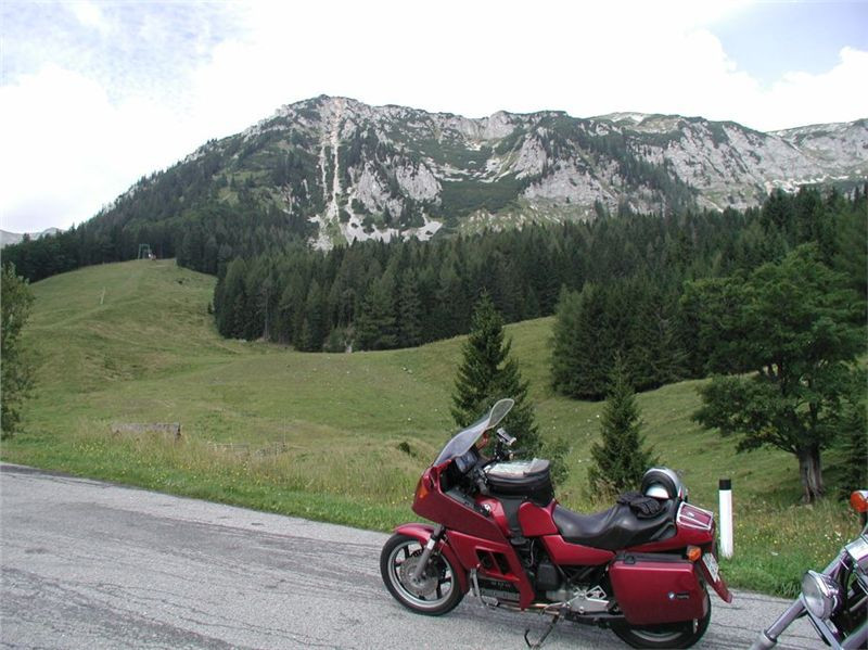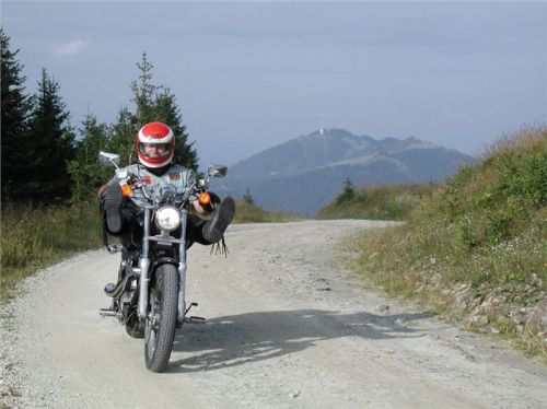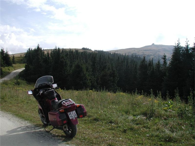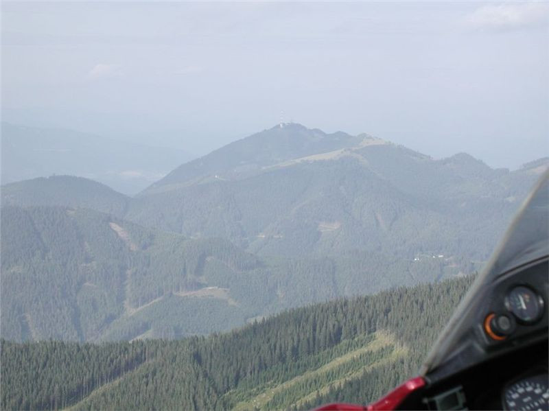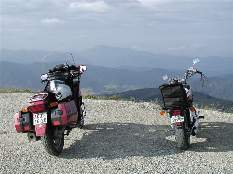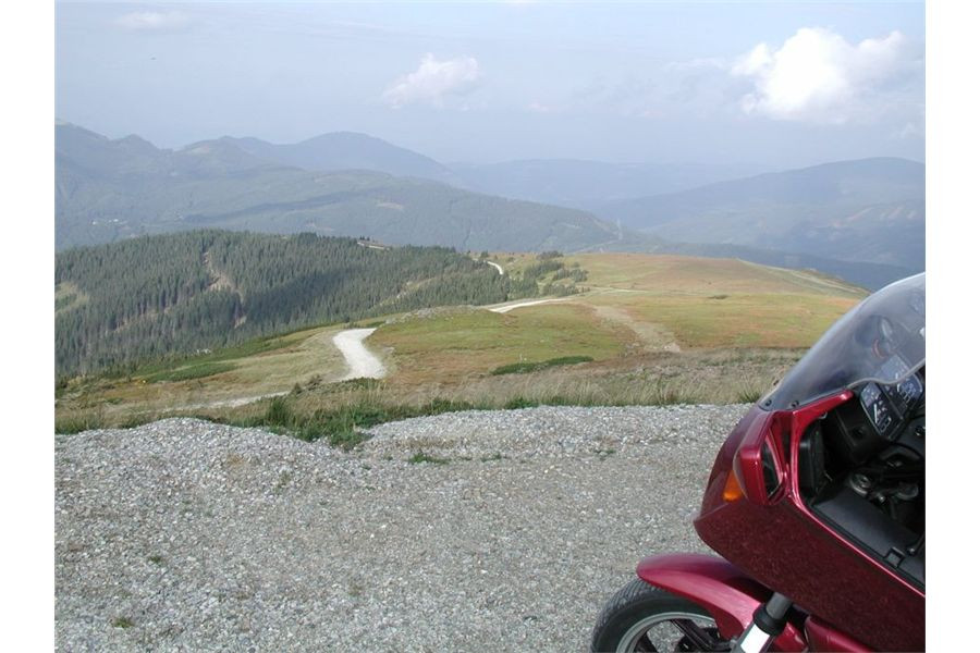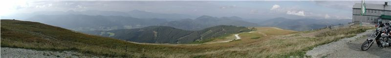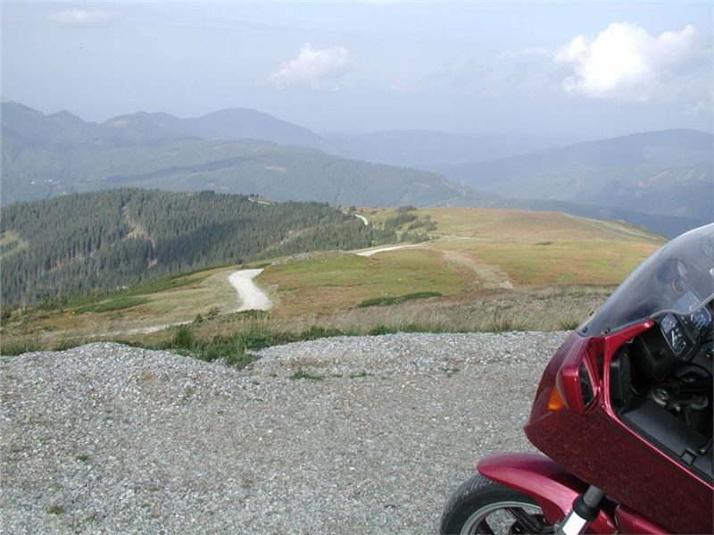 Máme před sebou delší etapu, protože dalším postupným cílem bude Semmering. Pokračujeme tedy mírným stoupáním do sedla (1170 m) před Gasenem, odtud klesáme do Birkfeldu, kde konečně otočíme směr sever a jedeme hlavním údolím Feistritz po „72“. Ta ale ústí do údolí pod Semmeringem poněkud „brzy“, takže po chvilce uhneme opět vpravo na vedlejší silničky, které nám dnes sedí více než hlavní tahy. V prvním záměru jsem chtěl za Rattenem najet na horskou silničku, která šplhá na dominantní hřeben po levé ruce tak do výše naší Sněžky, pak ale objevím na mapě ještě jednu, která (taky mýtovaná) vede výše. Takže pokračujeme o kus dále, stoupáme krásnými velkoryse trasovanými vracečkami do sedla Pfaffensattel (1372 m). Je tady (uzavřená) chata a hlavně, odbočka vlevo na horskou silničku na vrchol Stuhleck. Stavíme, abychom se jednak rozhlédli a druhak si přečíst infotabule. Z nich zjistíme, že mejto činí 2 €, takže jedééém…