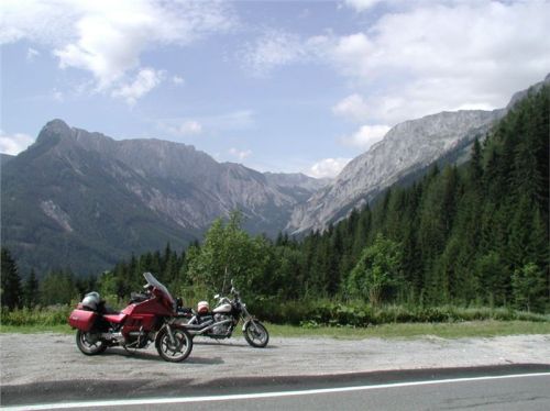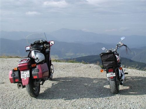 Sotva se před námi otevře hlavní údolí pod jižními svahy Eisenerzen Alpen, opře se do nás hajc s intenzitou hodnou lepší věci. Navíc se dostaneme do odpoledního dopravního závaru. Náš další cíl je určen Michalem, větší město Kapfenberg mu má poskytnout nákup kazety do kamery a pak se chce kouknout po prodejně vláčků Fleischmann, prej tu má bejt. Dobrá, táhneme se chvilku po hlavní, než usoudíme, že tohle je centrum, a malé parkoviště poskytne odstavení ve stínu. Je sice placené, ale my se postavíme tak, že nezabíráme žádné místo a stejně zůstanu u motorek, tak neplatíme. Michal odloží vše co je možno a vyrazí, já zatím ve stínu relaxuju.