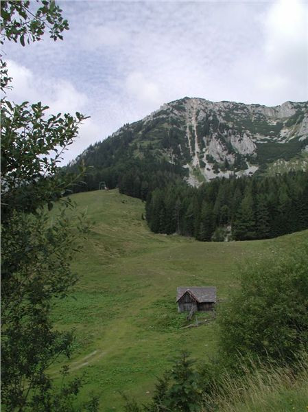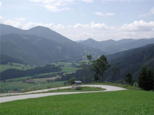 Pečlivější prohlídka map brzičko stanoví další cíl – o kousek dál vychází z Aflenz Kurortu horská silnička na Bürgeralm a dále na Windgrübe (1810 m), tož se na ni mrkneme. K odbočce je to necelých patnáct kilometrů, projedeme Aflenz a z rohu jeho náměstíčka jde ona silnička. Jedná se o typickou makadamovou účelovou komunikaci, asfalt končí za posledním stavením. Ale i když prašná, je vcelku kvalitní a dá se jet dva-tři, podle podmínek. První část vede podél horské bystřina, pak uhne prudce vlevo svahem a pěkně pořád nahoru. Předjedeme traktor s vlekem, ten je opatřený lavicemi a tvoří tak svérázný druh horské hromadné dopravy, veze vzhůru asi dvacku turistů. Pár kilometrů stoupání nás dopraví až k horské chatě Bürgeralm, za ní však dočasný lívanec znemožní další cestu. Podle cedule se tam nahoře staví a tak finito.