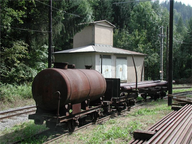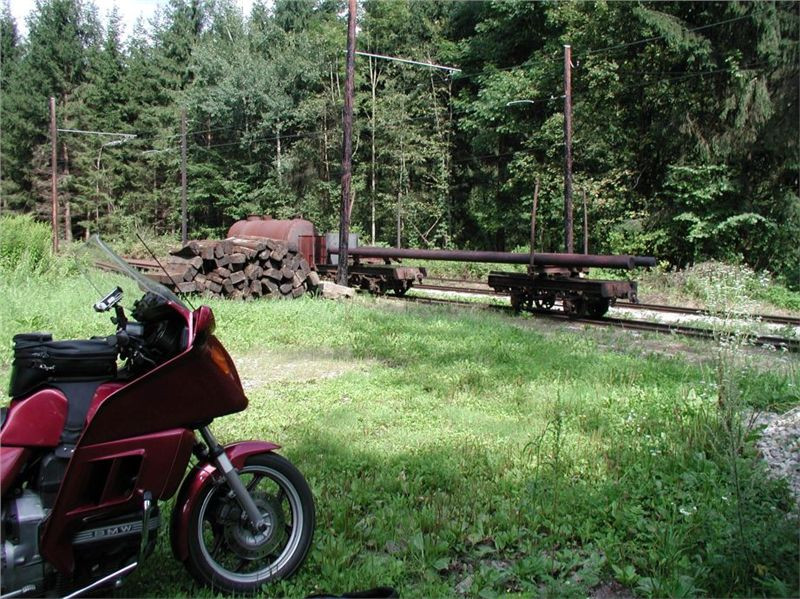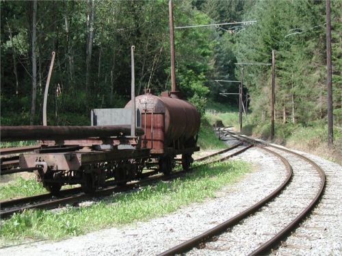 Já samozřejmě po chvilce orazu očichávám trať. Je to klasická rakouská 760ka a podle trasování, trolejového vedení (jednoduchý drát na dřevěných sloupech) a totální absence zastávek a stanic usuzuji na ryze nákladní provoz. Tomu svědčí i odstavený cisternový vůz a opleny s jedním stožárem na vedlejší koleji. Chvilku čekám, nepojede-li něco (koleje jsou poměrně čerstvě ošoupané), ale nic tomu nesvědčí, takže zrezignuju. No, alespoň jsem si očíhl trať, doma musím vytěžit net, cože to tu vlastně brouzdá….