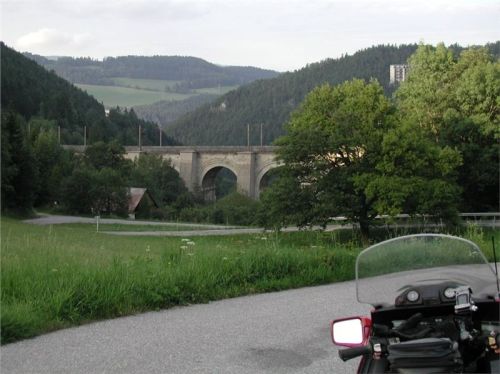 Projíždíme celými lázněmi, je tu klid, skoro mrtvo, jen bohaté fasády procovských lázní shlížejí kamsi do údolí. Všude kolem samá „30“, no, nebudem blbnout, tady můžou bejt cajti, takže se držíme na uzdě. Ono to taky na úzkých motanicích o moc rychleji nejde. Z východní strany hřebenu se postupně dostaneme na severní, serpentínky pozvolna klesají, až se dostaneme do jednoho z bočních údolíček, jehož závěr protíná jeden z několika viaduktů trati. Tak to si ujít nenechám, stavím alespoň na chvilku.