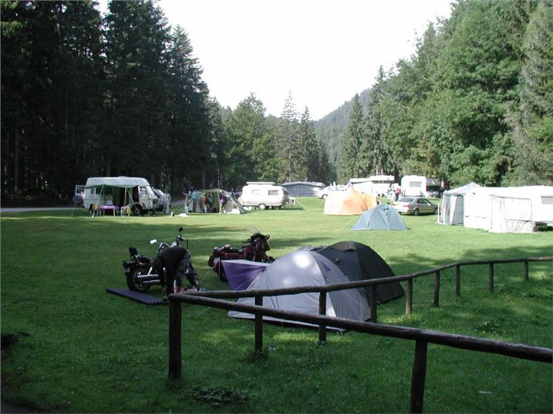 Nikde nevidím červenou VFRku, asi tady ještě nejsou. Michal ale zajíždí až k umývárnám, které jsou zcela nahoře, a tam objevuje Ernesty zašité za cípem lesa a zrovínka konzumující večeři. S touto novinou se vrací a vyráží pro piwko, já se zatím pl