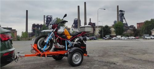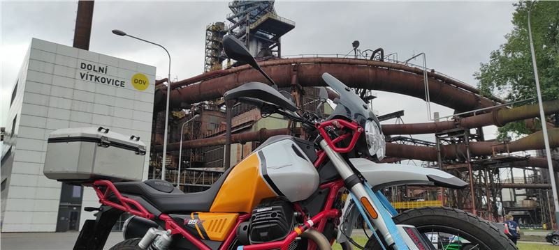První seznámení je fajn. Kombinace vozíku a naložené Moto Guzzi V 85 TT probouzí touhu někam vypadnout. Podzim, plískanice, motorka na vozíku, vyhřáté auto, v hlavě představa nasluněných zatáčkovitých silniček, cíl v navigaci Albánie, severní Řecko nebo tam, kde to máte rádi. No nic, trochu jsem se zasnil. Jedeme rychle do Dolních Vítkovic - vozík a industriální prostředí, že… Předpověď počasí totiž hlásí, že bychom nemuseli fotky stihnout suchým objektivem.