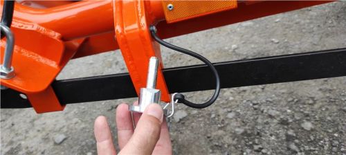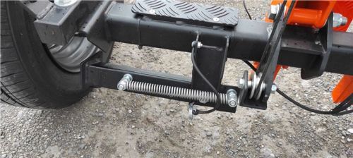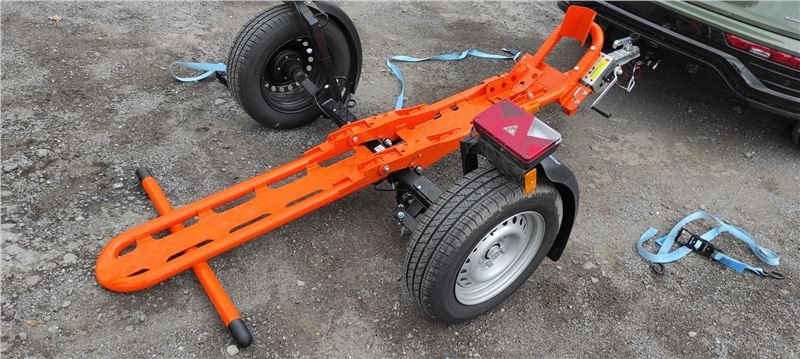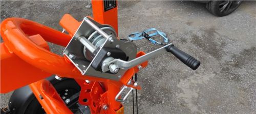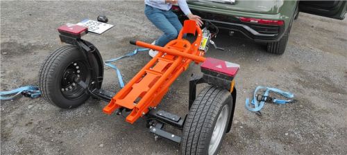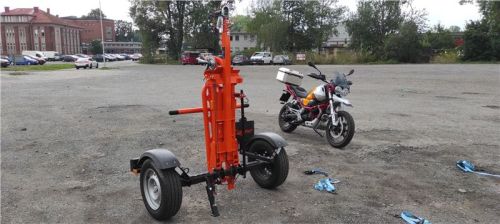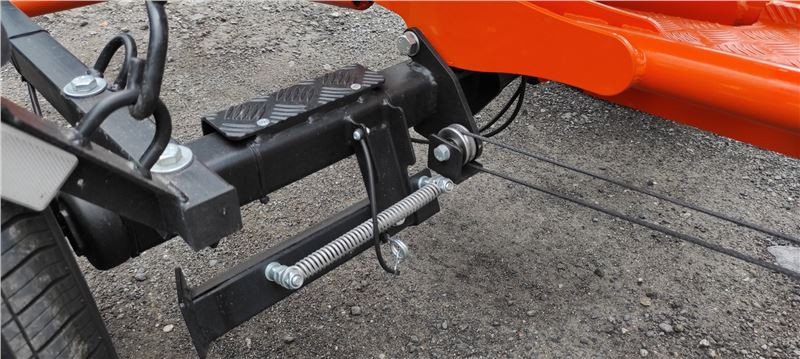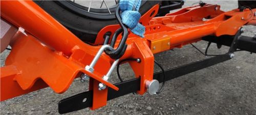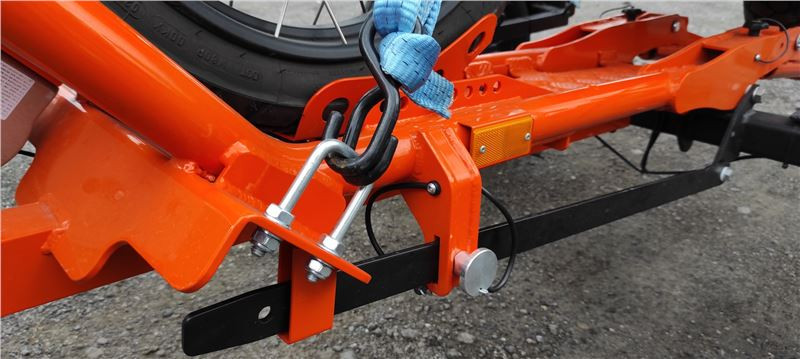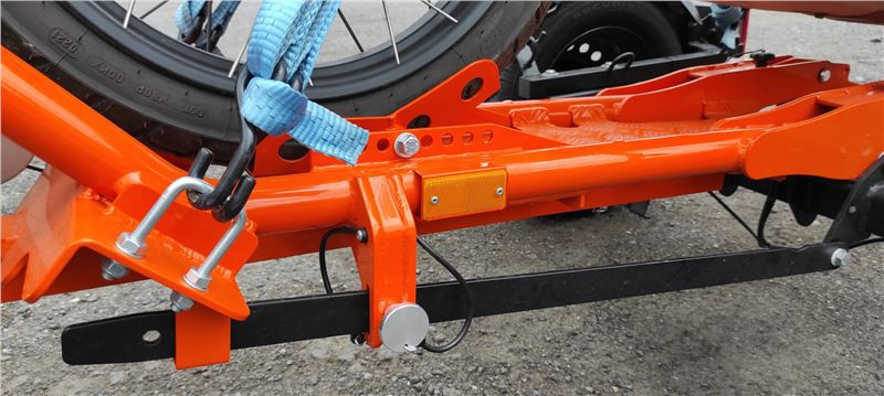 Teď je vozík vidět v celé své oranžové kráse, pro majitele KTM skoro na míru. Zadní výklopná rampa je jištěna šroubovacími spoji, ty se odšroubují, a protože jsou na „řetízku“, není nutné hledat místo pro odložení. Zadní rampa se ručně překlopí, našroubují se bezpečností šrouby, navijákem se sklopná konstrukce srovná do manipulační pozice, zajistí trnem a můžu vozík odpojit od auta.
