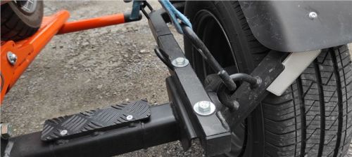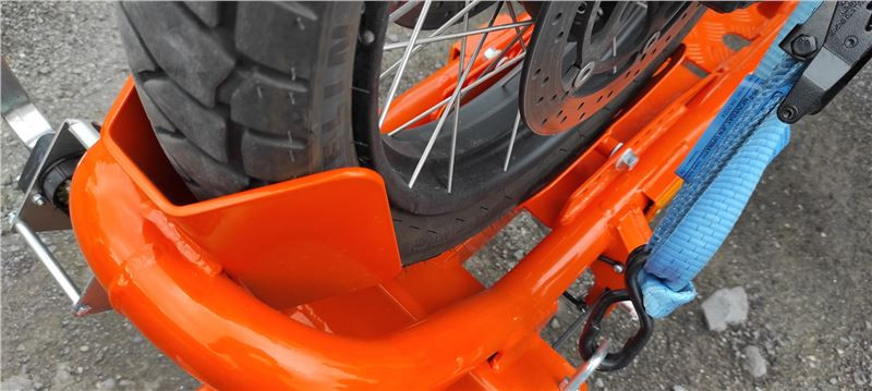 V této části je dobré mít u sebe pomocníka, který při uvolnění popruhů zmáčkne brzdu. To by šlo obejít mechanickým zajištěním brzdy hned po nakládce, na což jsou na internetu různé udělátka, ale zvládne to i stahovací páska. Motorka pak bude držet na vozíku díky přední kolébce sama. Samozřejmě záležet bude na její výšce a váze, proto je vhodná přítomnost druhé osoby, ale se standardní motorkou si poradíte sami. Přední aretační kolébka je nastavitelná pro různé rozměry do 21“, od výrobce ve standardu na 17“ kola, následná úprava na jiný rozměr zabere pár sekund.