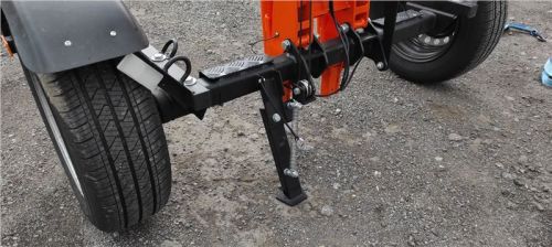 Jezdím s vozíkem tam, zpátky a je to pohoda. Váha vozíku je 105 kg, což při manipulaci díky delší ose není výrazně znát. Vozík má namontovanou výklopnou nohu, což je super vychytávka. Proč? No protože jej můžu ve vzpřímené poloze zaparkovat někde u zdi. Ušetřím tak spoustu místa na dvorku nebo v garáži. Na výšku mi stačí 210 centimetrů a u stěny necelý metr hloubky. Tohle je moc fajnová věc nejen do omezených prostor a malých garáží.