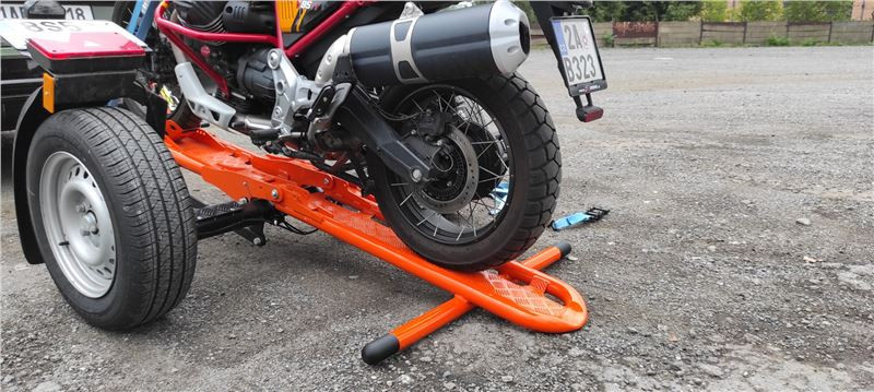 Nakládání je opačný postup vykládání a jde to jednoduše. Vozík k autu, svižně rozložit. Díky sklopnému mechanismu a celkové délce nájezdové rampy je nakládací úhel velmi příjemný a motorkou najedu tlačením, bez nutnosti startovat motor, nebo s pomocí druhé osoby. Srovnat rampu, zajistit, popruhy, hotovo.