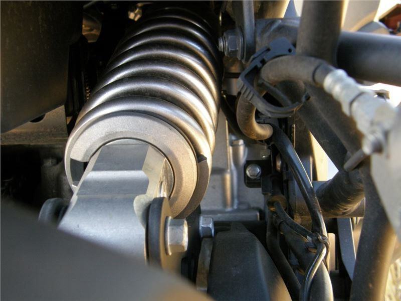 Odpružení zadní: horizontálně uložený tlumič, seřízení předpětí a odskoku