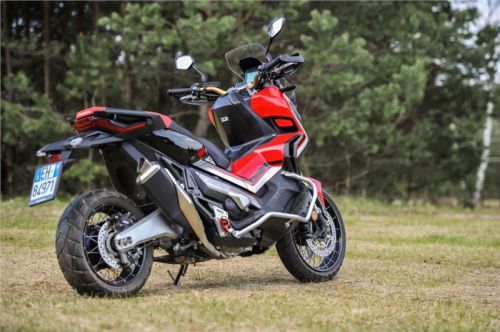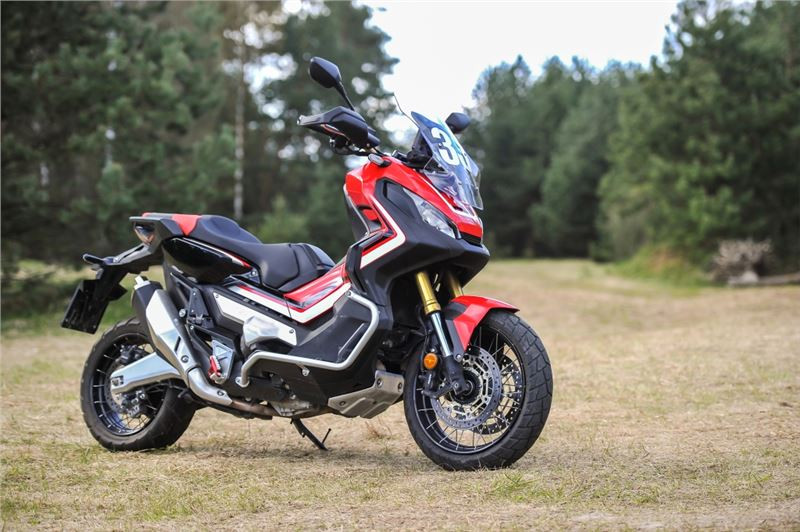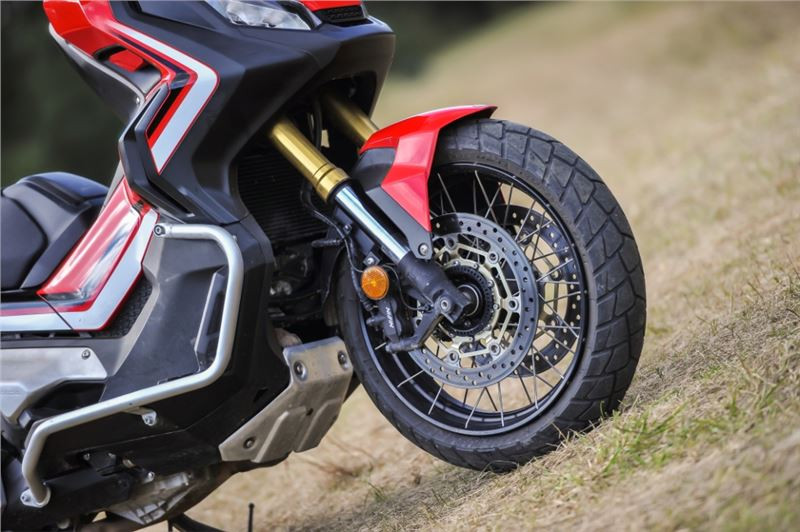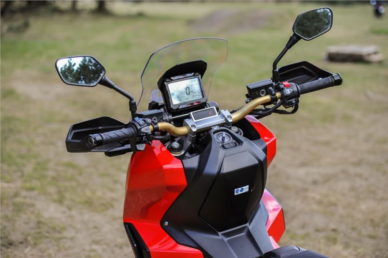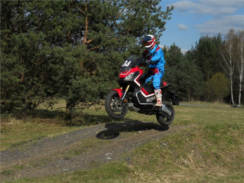 Přenášením váhy se skútr jednoduše ovládá, řídítka se drží o něco pevněji, jezdec je opřený o ruce a dojem z jízdy na enduru je opravdovější. Mnohem více stroj pod sebou vnímá a mám větší cit pro řízení i díky výbornému rozložení váhy samotného stroje, které je bez jednoho procenta v zadu 50/50. Na běžné silnici je pocit z jízdy s nohama na přídavných stupačkách sportovnější a X-ADV se citlivěji naklání do zatáčky. Nejeden stroj měl po celodenním ježdění tyto stupačky obroušené. Jen pozor při intenzivním brzdění, protože s ohledem na celkovou stavbu skútru neumožňují ideální oporu, na to je lepší podesta. A že je čím brzdit dokazuje fakt, že přední brzdový komplet je stejný, jako má Africa Twin.
