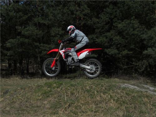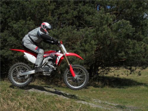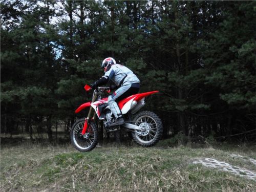 Trochu opuštěně tady stojí CRF450R, pochopitelně, není to motorka pro každého, ani pro mě ne :-) Je to masakr emocí a síly. Protože jedeme s klukama z www.okruhari.cz fotit do lesa a na mě nic jiného nezbylo, mačkám decentní čudlík elektrického startéru, přestože je tahle motorka standardně vybavena velkou nakopávačkou. Mmmm fajne...