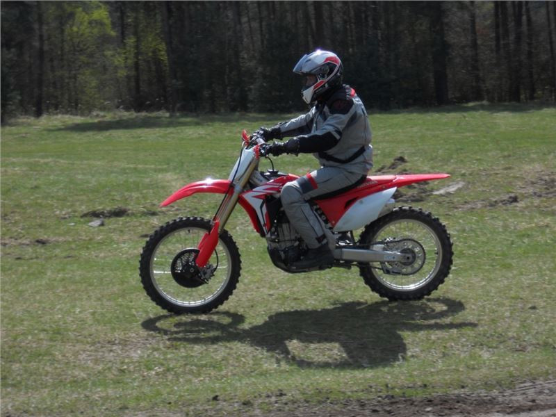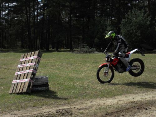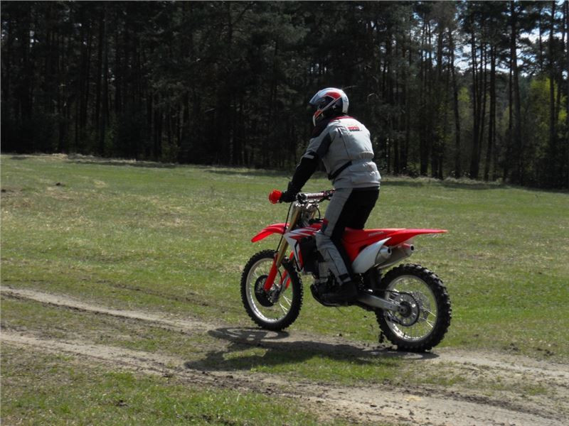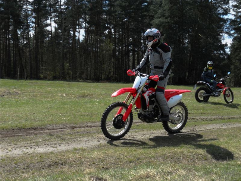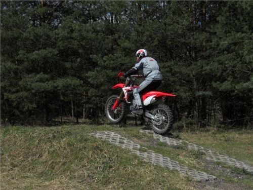 Nacházím kluky jak sjíždějí schody, a to už mi jízda na CRF450R přijde v pořádku. Ovšem pozor na přední brzdu. Přimáčknu více, než musím a jedu po předním :-) S CRF450R mám intimní chvilky během dne ještě několikrát a přestože jízda na ní je drsně zábavná a snad i návyková, rád ji po celkové hodině ježdění odstavuji do depa. Ruce mám vytahané jako opičák :-)