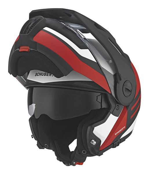 Schuberth E1 je vyklápěcí přilba, kdy bradová část se snadno odklopí spolu s plexi i s kšiltem (hledí a kšilt se odklápějí nezávisle). Hledí je samozřejmě odolné poškrábání, mlžení a chrání před UV zářením. Nechybí integrovaná sluneční clona s 80% zatmavením.