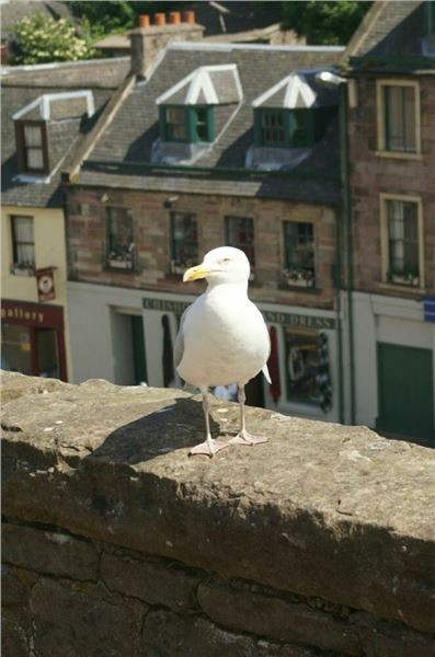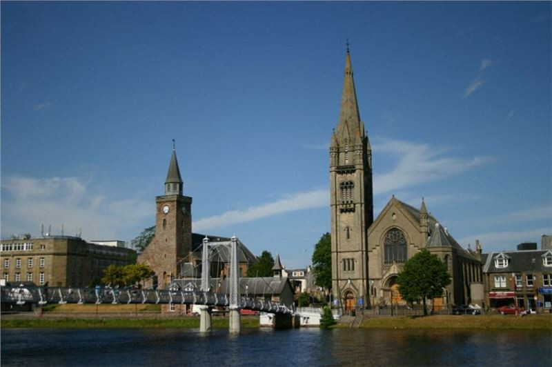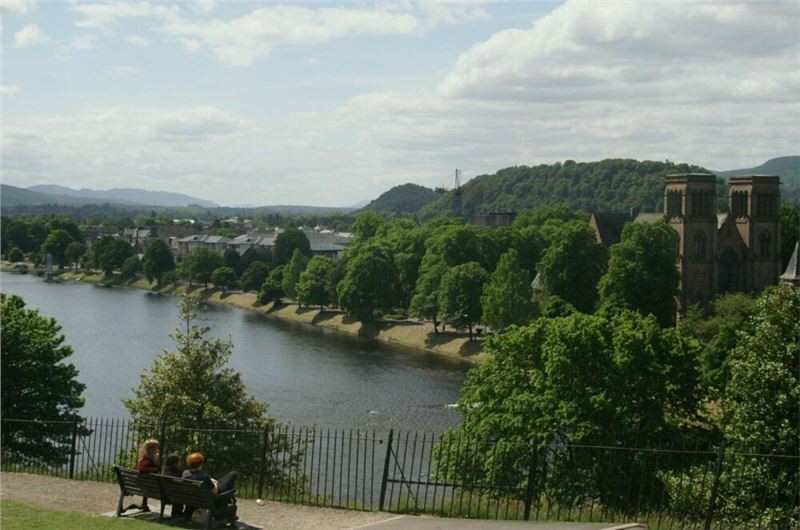 Na nábřeží se naše cesty rozdělí, Tesařovi se vydají směrem na hrad, my ostatní zamíříme přes historický most na levý břeh řeky Ness. Počasí přeje, město se koupe ve slunečním přílivu, takže podívaná a focení je vynikající. Hodinku a půl strávíme procházkou nábřežími, k jejímu konci zapadneme do krámu se „skotskými reáliemi“, od obligátních kiltů, přes šperky a plédy až po cokoliv, co má na sobě alespoň něco ze skotské historie či symbolů. Pravda, takový trochu lapač na tůristy, ale když je to skotský, tak proč se tam nejít podívat. Každý si samo něco odnese, já přemýšlím, co by asi tak Janě udělalo radost. Pléd, jo, ale balík je to objemný a vláčet ho na Ká by byl vopruz. Sukně, OK, ale co když nebude pasovat, Janiny míry neznám a v ruce nemám, takže mínus. Nakonec padne volba na místní odrůdu dámského kloboučku, Jana pokrývky vlasů má ráda a nosí je a já si výběr nechám schválit přítomnou zástupkyní druhého pohlaví. Takže dárek je vyřešen :-). Zbylý čas do společného oběda strávíme rychlým výstupem na předhradí a krátkou prohlídku města z ptačí perspektivy.