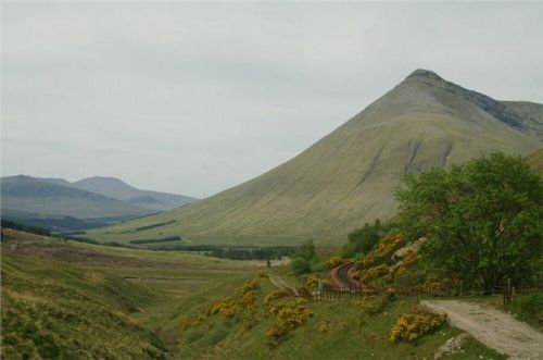 Sjedeme zpět na hlavní a spustíme se do údolí Glen Dochart (pro příště, trochu názvosloví – ve skotském hantecu Glen = údolí, Loch = jezero, Ben = hora, kopec, Point = mys a tak dále... takže už nebudu požívat debilní slovní spojení „jedeme údolím Glen XY“ a tak podobně), které nás dovede až do osady Crianlarich. Ta je důležitou křižovatkou dvou hlavních silnic, my se dáme podél železniční trati na severozápad. Za další vesničkou Tyndrum opět uhneme vpravo, silnice táhle stoupá do dalšího sedýlka. V něm opět na chvilku zastavíme, hlavně pro ukojení fotovášně a trochu se taky rozhlídnout, že. Pro společníky jsou kopce kolem úplně něco nového, pro mne oživení vzpomínek šest let starých. Počasí zatím maká na sto procent, okolní vrcholky jsou impozantně prozářeny a hrají všemi odstíny syrového severu.
