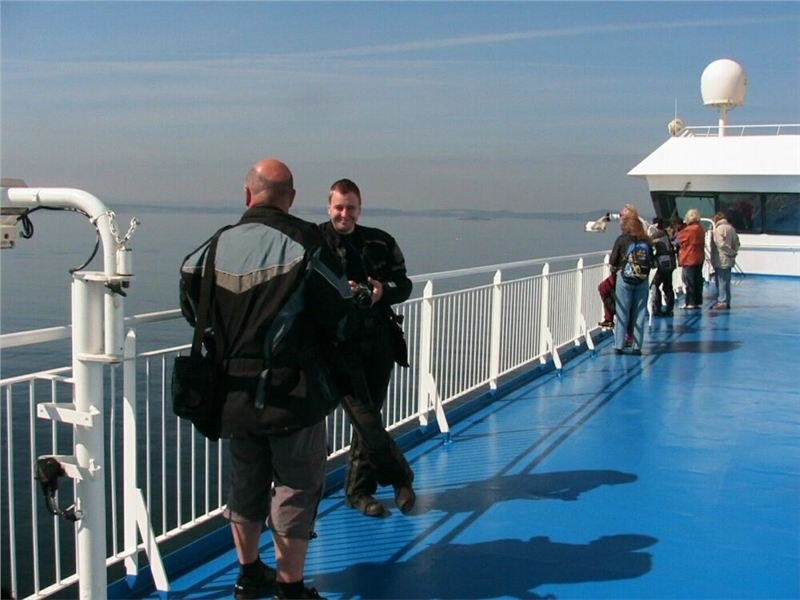 S výbornou náladou se vrhám na vyhlídkovou palubu a vychutnávám si svěží a časné jitro na liduprázdné palubě. Je jasno, jen anglické pobřeží na levoboku je zahalené do ranního oparu nebo mlhy, zdá se, že můžeme v souladu s předpovědí očekávat hezký den. Na procházce potkám Jirku, takže chvilku postojíme u zábradlí společně.