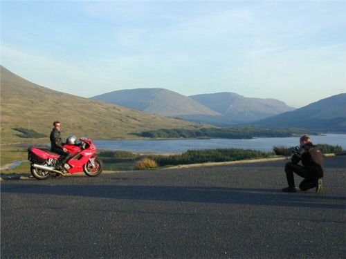 Průjezd podél jezera mne po pravdě trochu zklamal. Až k vodě sahá hustý porost Eredine Forest, tedy výhledy se jaksi nekonají, navíc není možno nikam čumět, neboť silnička se klikatí jen což. A aby toho nebylo, zapadající slunce prudce prosvětluje listnatý porost, takže povrch silnice hraje ďábelskou projekcí světla a stínu, což alespoň mně vadí při sledování stavu a povahy vozovky. Na asfaltu se sem tam koná náplava všelijakého bordelu, jednou dostanu docela slušného šmýra, ale guma se vzápětí chytne. Prostě, z těch dvaceti majlí mám prd, a navíc mne to tu dost prudí, protože ty vepředu sotva stíhám! Jasně, přeci jen je pořád přítomen malý blok z nedávné bouračky, takže se neodvážím klopit tak, jak dříve.