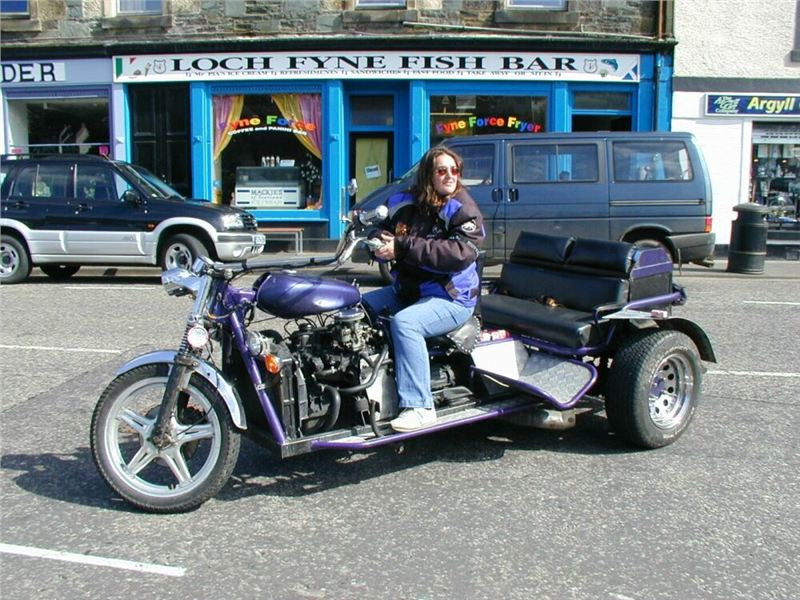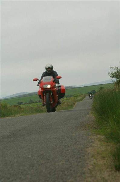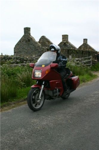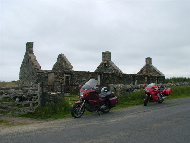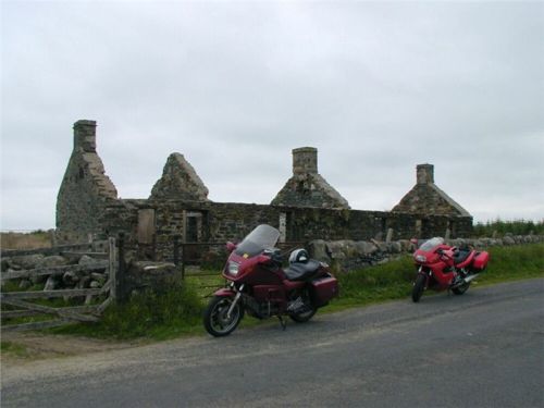 Dříve však přijde ona odbočka, tak s Johnnym čekáme na ní. Pět minut, nic, deset, nic, pomalu začínáme nejistět. Vyfotit hrad, byť tak neobvyklý, by nemělo trvat dlouho! Už se chceme vydat naproti, když tu se dvě zbývající mašiny objeví. Příčina je objasněna ihned, koneckonců levá část Dukny hovoří řečí jasnou a výmluvnou i beze slov. Silniční lišej prosvítá deklem kufru i kapotou, pša krew... Naštěstí, pád se nekonal za pohybu, leč při zastávce. Z kopce stojící Italka usoudila, že se pohne i přes zařazenou jedničku, a už to bylo... nejhorší je však pěkně v půlce přeražená spojková páčka. Naštěstí, dvěma prsty se řadit dá, protože Jiřík samozřejmě náhradní nemá. A že by skotské západní pobřeží zrovínka překypovalo dealery ducatích produktů, tak na to bych se skálopevně nespoléhal. Bude halt muset jezdit a spojkovat pahýlkem, pomyslím si. V koutku mozkových závitků hřeje myšlenka, že moje dlouholeté vození této maličkosti v útrobách Káčka má přeci jenom své opodstatnění....