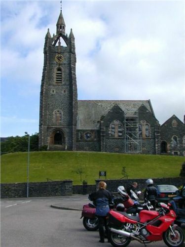 Čas dost pokročil, je půl čtvrté, a do Tarbertu mil patnácte. Jedeme zvolna, takže se na kraji přístavního městečka zastavujeme u netypicky postaveného kostelíka lehce před třetí. Zaujme nás zajímavě uloženým zvonem na kamenných nosnících místo střechy. Po několika dnech ale zjistíme, že je to tady celkem obvyklé stavební schéma, teď a tady je to ale novinka. Bekr samozřejmě vyráží na detailní průzkum, my ostatní jej pozorujeme z parkoviště.