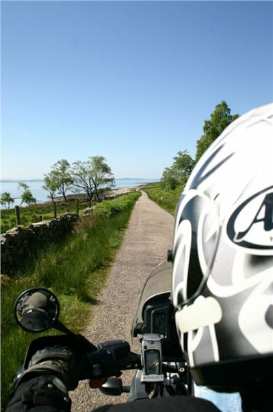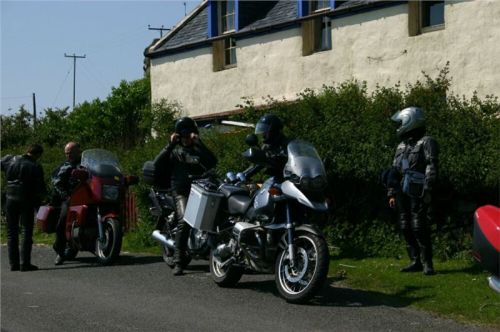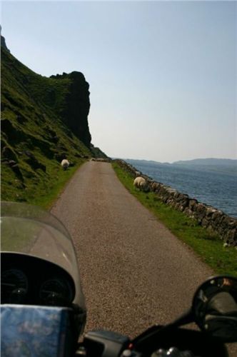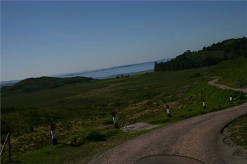 Malá ručička atakuje druhou, když se konečně odebereme ke strojům a vyrážíme dále. Jak se tak motáme přes menší poloostrov do Dervaigu, kalkuluju v duchu hrubou ETA na Ionu, a popravdě, moc mi to nevychází, tedy spíše, bude to dost těsný, počítám-li i návrat. Kilometrově toho před sebou nemáme moc, ale naše rychlost prostě nemůže být vyšší, na to není ani silnice, ani stroje (snad jen Jiříkova Dukna...) a navíc ani jezdci. Stavíme jednou v malém sedle nad osadou v klínu pahorků, druhá zastávka je už na východním pobřeží v zátoce Loch Keal u jakési polozřícené usedlosti, porostlé ale pěknými kvítky. Tady už při odečtu hodin je jasné všem, že neustále běžící čas se stane naším nepřítelem pro zbytek dne.