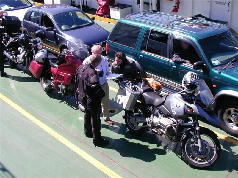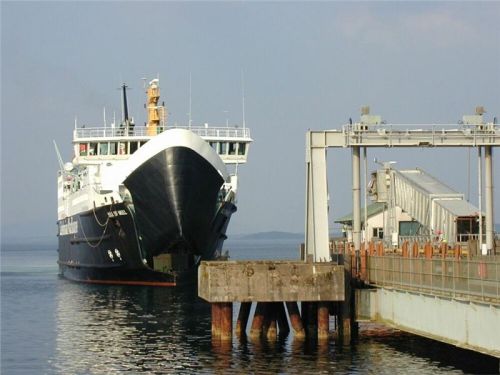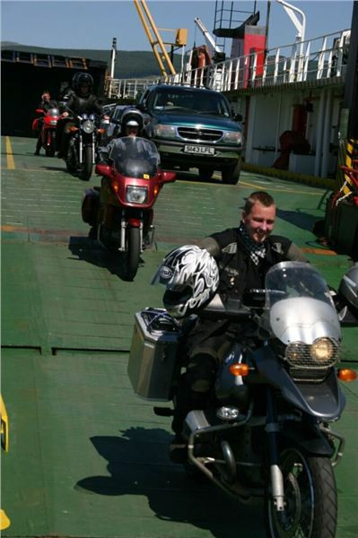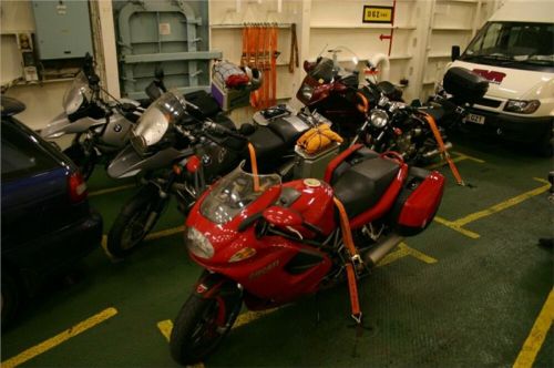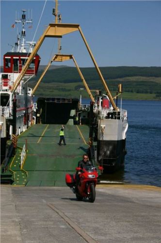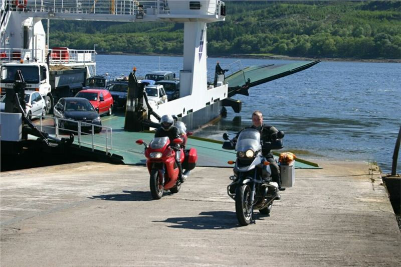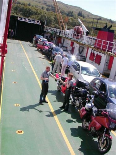 Za chvilku je jasné, za co se platí. Přijíždí pro nás regulérní loď, ne nějaký umrněný prám. Má zpoždění, teprve ve čtvrt na osm zvolna přiráží, když před tím zvedne příď. Protože je dost aut, tak se na palubu dostáváme až k půla. Dokonce nás lodníci poutají k palubě (tedy ne fyzicky, ale jenom naše stroje), i když se jedná pouze o přeplavbu úžiny a vlnobití také nehrozí. Zajímavo, prám nevyžaduje poutání, loď ano. A vzpomínám, že před šesti lety při naší plavbě ze Skye do Malaighu, což bylo asi tak stejně dlouho a loď byla myslím identická, tak tenkráte nás nepoutali.