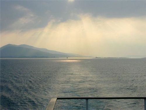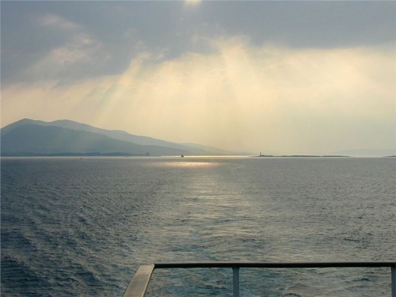 Sotva se trochu ometeme kolem, už se zpoza mysu ozve temné dunění dýzlu a prám, poněkud větší než ten před chvilkou, je tady. Zadkem se přitočí k molu, bouchne rampa, těch pár aut vyjede a je řada na nás.