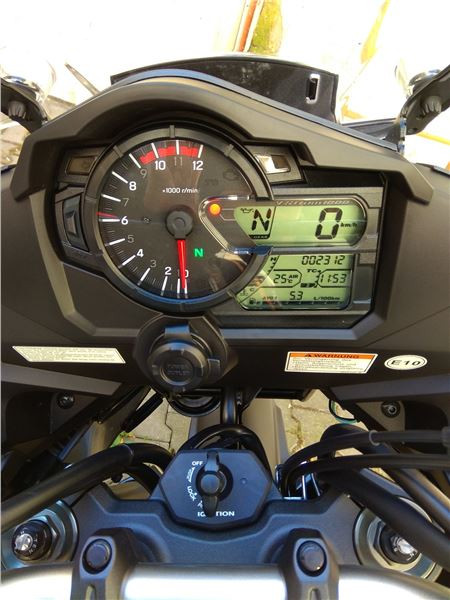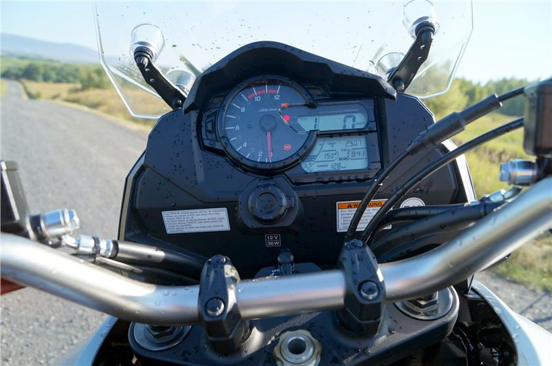 Komunikace mezi motorkou a jezdcem probíhá skrze přehledný a dobře čitelný digitální displej. Analogový zůstal otáčkoměr a celkově je kaplička úsporná a přehledná. Přímo uprostřed ní pod otáčkoměrem naleznete zásuvku na 12 V. Displej podává info o dvou tripech, venkovní teplotě, spotřebě, dojezdu, zařazené rychlosti a zvolené úrovni kontroly trakce. K dispozici jsou polohy Vypnuto, 1 a 2 dle míry zásahu do chování zadního kola.