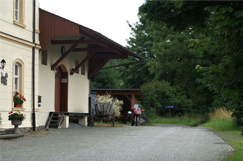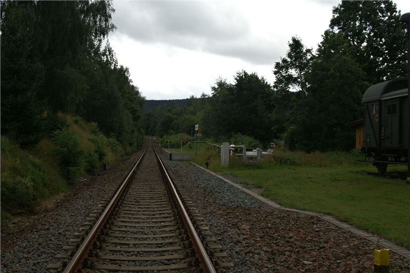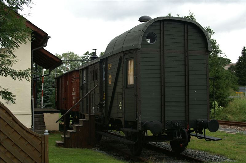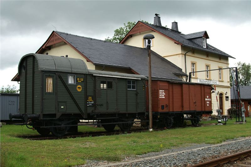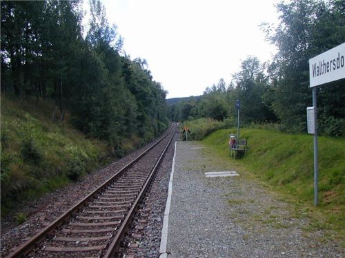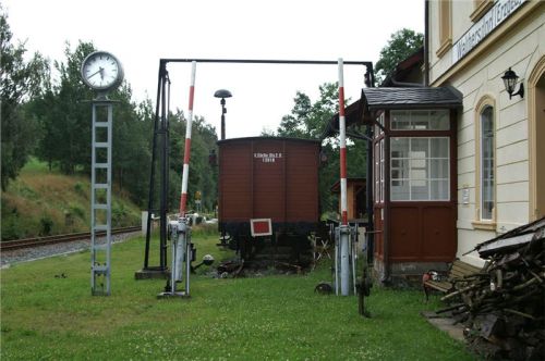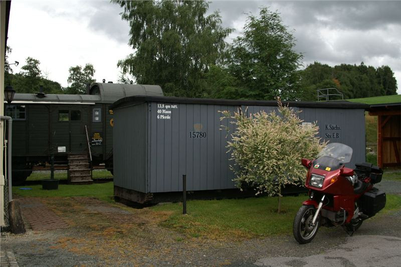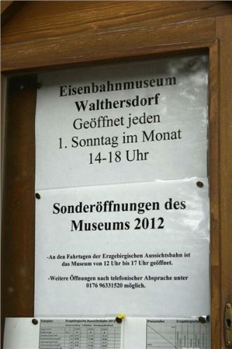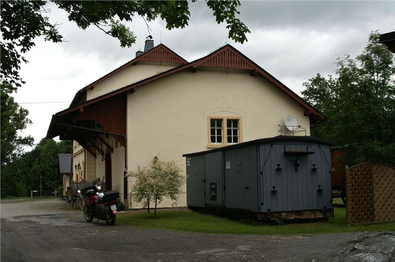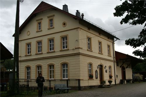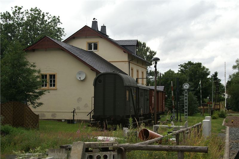 em si přeci jen dám zastávku. Koutkem oka zahlídnu na souběžné trati nějak divně postavené dva vagóny, vrátím se a ejhle, malé místní železniční muzeum. Dříve stanice Walthersdorf podlehla německé (nejen) redukční dietě, přišla o staniční koleje a výhybky a stala se z ní pouhá zastávka. No a nádražní budova je nyní soukromý dům (dva byty) a v kusu je i malá expozice zdejší trati Annaberg Buchholz – Schwarzenberg. Bohužel, je pátek a tedy zavřeno. Nevadí, pro nás to přináší možnost si trochu odfrknout a prohlédnout si horské nádražíčko alespoň z exteriéru. Takže další půlhodinku se já věnuju glajzám, Jana spíše šmejdí kolem a prohlíží si baráčky a jejich zahrádky.