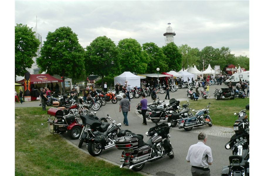 Že hogaři ve Vídni to mají položený trošku jinak jsem pochopil, když hned první stan, kterej jsem po příjezdu zaregistroval, patřil „81 MC“. Pokérovaný svalnatci tam nabízeli supportní trička a jiný suvenýry. I ostatní H.D. městečko dobrý: spousta silikonu, botoxu a tak. Semtam zajímavá stavba, stánky jednotlivejch dealerů s novejma modelama (bajky) i modelkama (řidičky). Ukázali se tam i kluci, kteří vyrábí elektronicky zavírací laufy Jekyll&Hyde (PROČ JAKO???J). Když ty roury otevřely, zvuk byl fakt povedenej, jinak to znělo jak vysavač z teleshopingu Horsta Fuchse. Ceny za občo trochu vyšší; nebyl problém za párek v rohlíku dát sedum euro. Ale je fakt, že ten hotdog byl o velikosti štangle salámu zapíchnutý do veky. Celkově ale atmosféra hóóódně přátelská, i když na zádech nemáme žádný nášivky a nejsme oblečený v hadrech za sto litrů. Samozřejmě i tady se našlo pár „tvrďáků“, kteří za jízdy kouřili doutník, ale rosolnatý pacičky se jim klepaly nervozitou… Muzika vůbec nebyla marná, chvíli reprodukovaná, chvíli live. Jako doprovednej program magor, kterej jezdí stundriding na H.D. Vidět ElectraGlide lítat po zadním kole - paráda! Škoda, že jsme nic neviděli, zrovna jsme si na druhý straně městečka dávali gábl a na tohle zapomněli - ostudy!!!