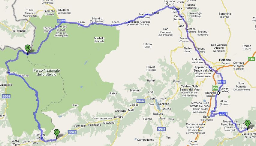 Z Cavalese vyjíždíme po silnici 48 směrem na San Lugano a Oru. Silnice je perfektní, suchá, poměrně živý ranní provoz, protože místní Italové jedou do práce, a tak koukáme, že plná čára je pro zdejší řidiče spíše orientačním prvkem, označujícím polovinu silnice. Co se týká předjíždění, neznamená pro ně prakticky žádné omezení. V Oře odbočujeme na údolní dvanáctku a v nepříliš husté a plynule jedoucí koloně se posouváme k Bolzanu. Odsud využíváme pro zrychlení přesunu do Merana neplacený dálniční úsek.