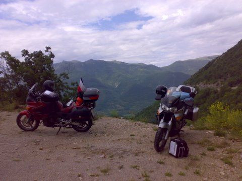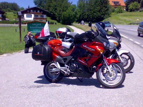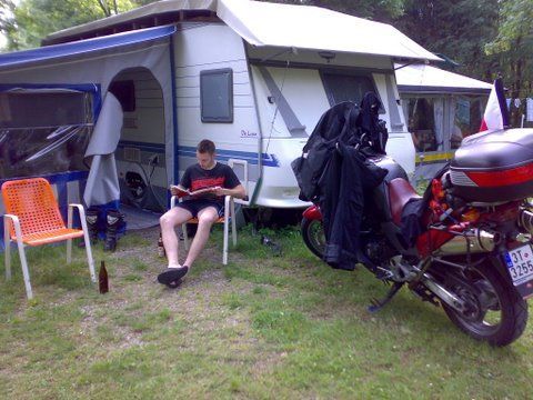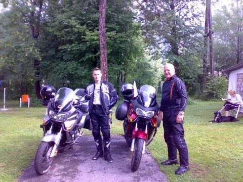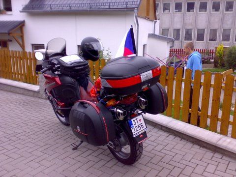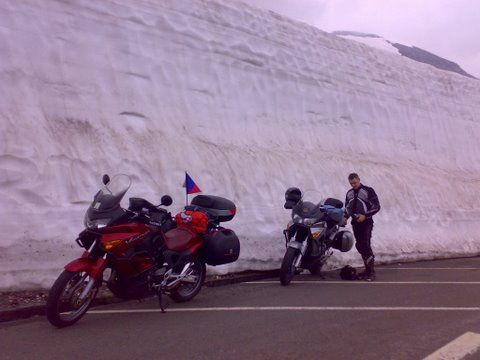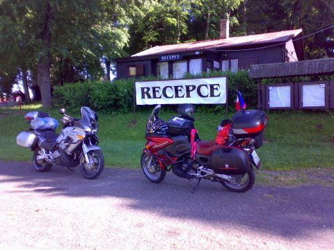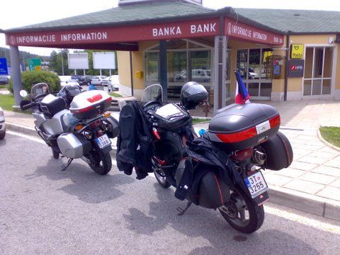 Již během cesty vysvitlo sluníčko a my si to začínáme náramně užívat. Stroje šlapou jako hodinky a i přes totálně naložené tři kufry + tankvak, stan + spacák atd. jede Varadero (obé) jako ďas. Snažíme se dodržovat předpisy, ale jakmile se ukáže pár krásných zatáček, bereme za plyn. Střídáme se vepředu a kdo nezažil jízdu, kdy máte před sebou úplně stejně naloženou motku a na ní synátora, jak jde do zatáček, až se tají dech, tak nepoznal ten pocit úzkosti, ale i neskonalé radosti a pýchy. Ale Michal se vždy vymlouval, že já jej tlačil…!