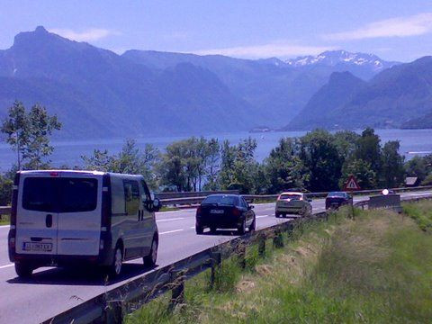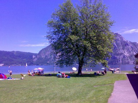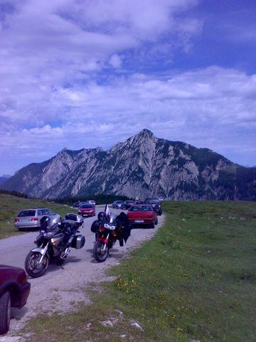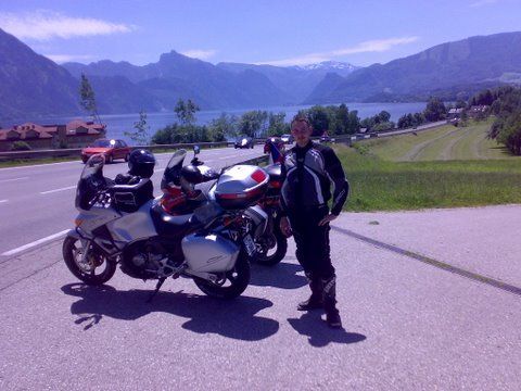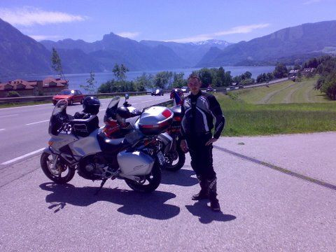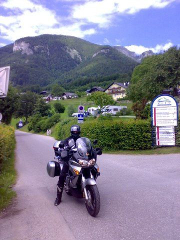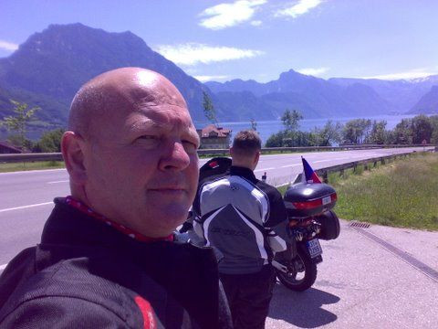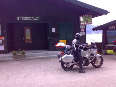 Probuzení je velmi příjemné neboť svítí sluníčko, a tak nespěcháme. V klídku hygiena (tamní společné toalety nic moc), balení strojů, snídaně, nezbytně vše dokumentováno a už mažeme směr Rakousko přes Frymburg, kde plníme tanky, Vyšší Brod a Studánky. Vstupujeme konečně do "země zaslíbené" bajkerům. Po místních okreskách a hlavních silnicích - zcela záměrně - se blížíme ke Gmunden, které míjíme a již se kocháme pohledem na jezero Traun-see a malebnou krajinou kolem. A ty cesty?! Opravdu nádhera a kocháme se tak, že zajedeme do slepé ulice, a tak se musíme kousek vracet. Mezitím si ještě dáchnem na sváču na břehu jezera v jednom z kempů a koukáme jako diví, že je plno koupajících se, asi otužilců.