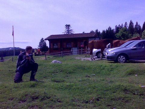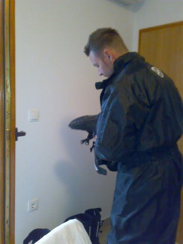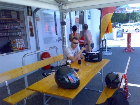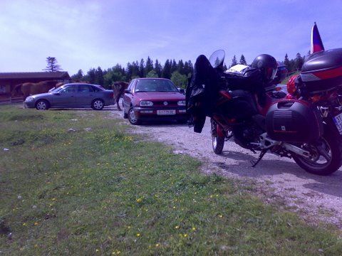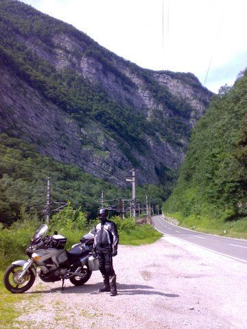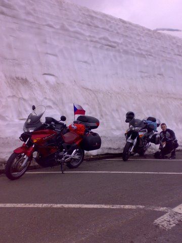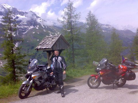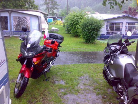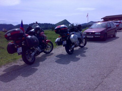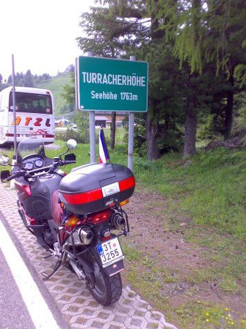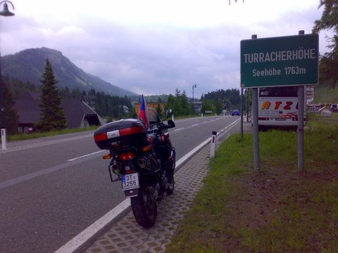 Tento den jsme si s Michalem řekli, že si dáme každý pár kiláků po okolí sám, jen tak si pojezdit sólo nalehko, takže si říkám, kouknu se na svahy v Badkleinkircheim a po okolí a hupky-dupky do kempu na bier und schnaps. Tak se i stalo - počasí tak akorát, pod mrakem ale teploučko, jen tak do motoriflí, krátký rukávek pod bundu, rukavice a hybaj na cesty. Kdo jezdí do Rakous, ví, že tam se vyplatí dodržovat předpisy, a tak opravdu padesátkou se houpu v zatáčkách a kochám se po okolí. Minu sjezdovky v Bahklien-Kircheimm a přede mnou se otevře krásná cesta údolím. Vesnice jen sporadicky, začnu tahat za plyn a užívat si jízdy. Až když celý upocený stavím na passu a fotím se u tabule Turracher Höhe 1783 m n.m., koukám na budíky a hladový oko nesvítí, ale září jako měsíc. Jen jsem si uvědomil, že cca 50 km po cestě jsem pumpu nepotkal, a tak se spouštím druhou stranou dolů. A tímto mé trable začaly. Jedu jedu jedu a pumpa nikde, tak si říkám kouknu do mapy, kde že jako jsem a ejhle, tankvak i mapy v kempu a mobil taky! Zapomněl jsem podotknout, že z mraků začaly padat kapičky, měnící se v kapky za sebou rychle jdoucí, a nádrž začínala smrdět suchem! To už jsem jel fakt jen podle intuice a dědina nikde. Točil jsem se furt za levou rukou, tak abych uzavíral pomyslný kruh od doby, co jsem vyjel z kempu. Konečně vesnice, lidi a dotaz na pumpu, kam jsem dojel již jako vodník. Ale i tak se hrdinně soukám do nepromoku, který od této chvíle držel veškerou vodu a nepustil ji ven. Zpočátku to fungovalo jako výměník tepla, od těla se ohřála voda, nepromok teplo ven nepustil, tak vše OK. Ale jen do té doby, než v kotli vychladlo, a pak to začalo fungovat opačně. Pumpař poradil kudy tudy, ale zprvu nechápal, odkud se ten "vodník" divně mluvící vzal a kam míří a poslal mě přes Katschberg-tunel zpět na Spittal. Ale nedodal, že za ten tunel budou chtít tuším 8,5 €, tak jsem před mýtnicí svého Varana otočil na pětníku čelem vzad a v protisměru mizel a fičel po cestě nad tunelem. Díky tomu jsem si dal Katschberg pass 1641 m n.m. a za stálého deště jsem se vrátil do kempu, kde již sušil své věci synátor. Ten pro změnu najel nechtěně na dálnici a ve Villachu se otočil a po ní se vracel taky za deště zpět. Oba jsme se pobavili, a pak kdo je po kom?!
