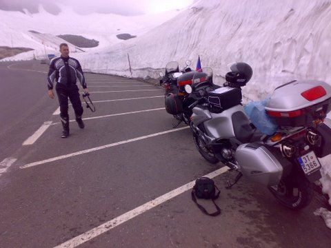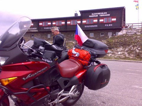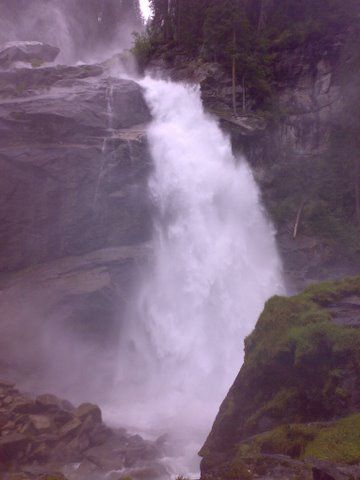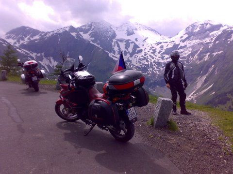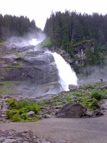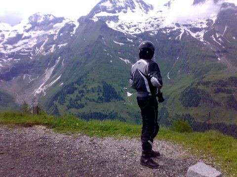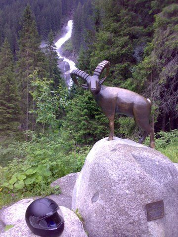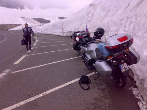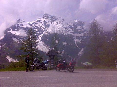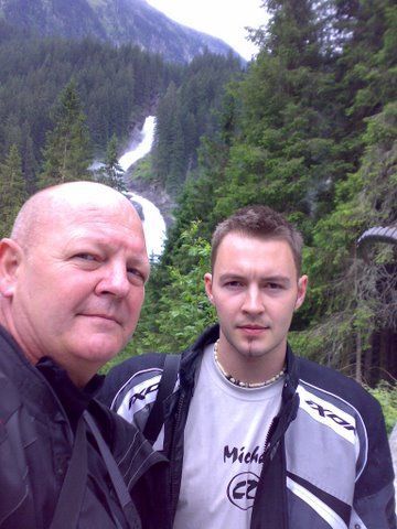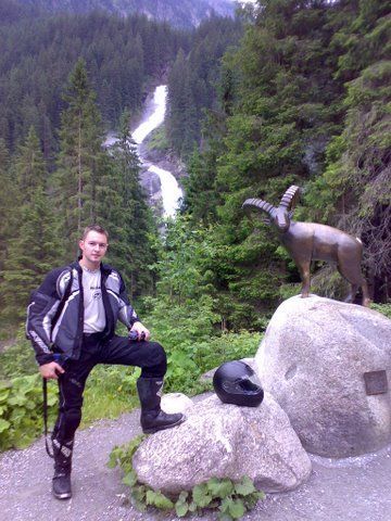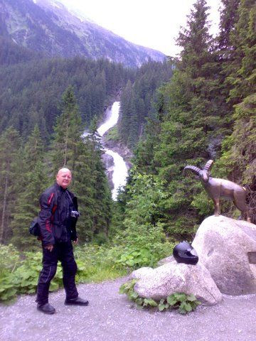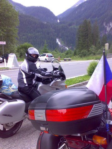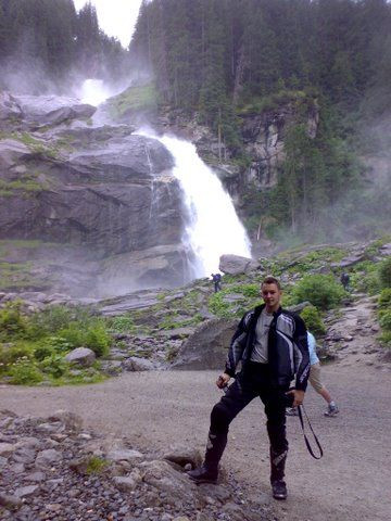 Po vydatné snídani balíme a strojíme naše koně. Obloha teda nic moc, spíše nic než moc, za drobného mrholení míříme směr Krimmelské vodopády a pak zpět a hurá na Grossglockner. Na parkovišti u vodopádů potkáváme partičku bikerů z ČR a ti nám radí, že Grossglockner nemáme dnes dávat, že mlha atd. Ještě že jsme na ně nedali. Vodopády super a prý je dobré je skouknout celé, ale nebyl čas. Rozpis trasy daný, tak pár fotek a po prohlídce za mírného deštíku mažeme zdolat to, po čem jsme prahli. Je asi zbytečné psát o kvalitě cest a tak, to musí fakt člověk sednout na mašinu a vyrazit a pak uvidí a pocítí na vlastní kůži, jak mají cesty vypadat!!!