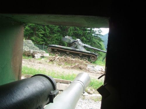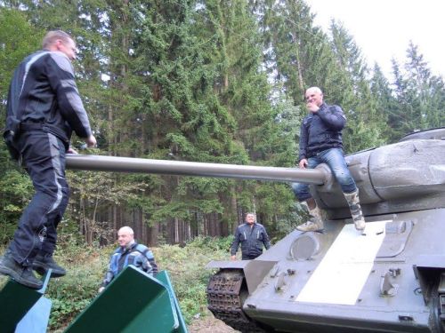 Pro překonání hranic totiž vybírá Marvy Würzenpass, který je pro své zatáčky vítaným zpestřením dnešní trasy. Na vrcholu, poblíž hranice, je pro nás také jeden z cílů našeho cestování, a tím je Bunkermuzeum. Nedaleko silnice, kde na malém parkovišti musíte zanechat své stroje, je v lese pevnost z dob Studené války. Dnes už máme málo času, tak se alespoň fotíme u tanku T-34, stojícího hned u silnice. Muzem je to ale zajímavé. Před rokem jsem tudy náhodou s Medvědem putoval a tehdy jsme se sem podívali. Pevnost sloužila až do devadesátých let minulého století a měla zajišťovat obranu Rakouska před sousední Jugoslávií.