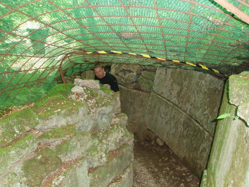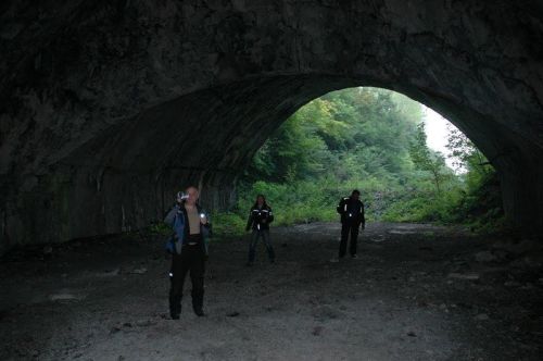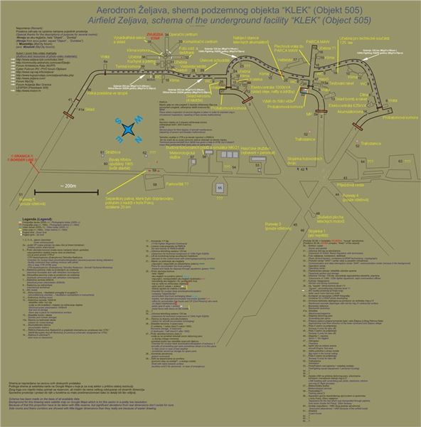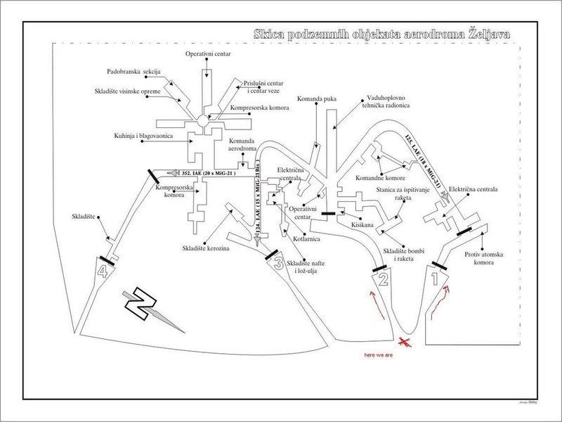 Motorky necháváme venku před jedním z tunelů a vybaveni svítilnami se vydáváme do podzemí. Vjezd je částečně zavalen hromadou kamení a hlíny, aby se dovnitř nedalo zajet autem. Pro nás ale naštěstí není problém přelézt. Vybavení je odsud většinou odvezeno, pár věcí ale stále leží na svých místech. V jednom z tunelů jsou stále uzavřena těžká vrata vážící sto tun, lze je však obejít nouzovým průlezem. V jiném jsou vrata uprostřed roztržena výbuchem, který šel zevnitř, protože zbytek vrat je prohnutý ven. Podle našich informací bylo celé letiště zničeno Srby při ústupu z těchto míst. Ze stropů místy visí na zbytcích armování kusy poškozeného betonu. Pod vrstvou prachu je ale na podlaze stále vidět vodící čáry a různé značky.